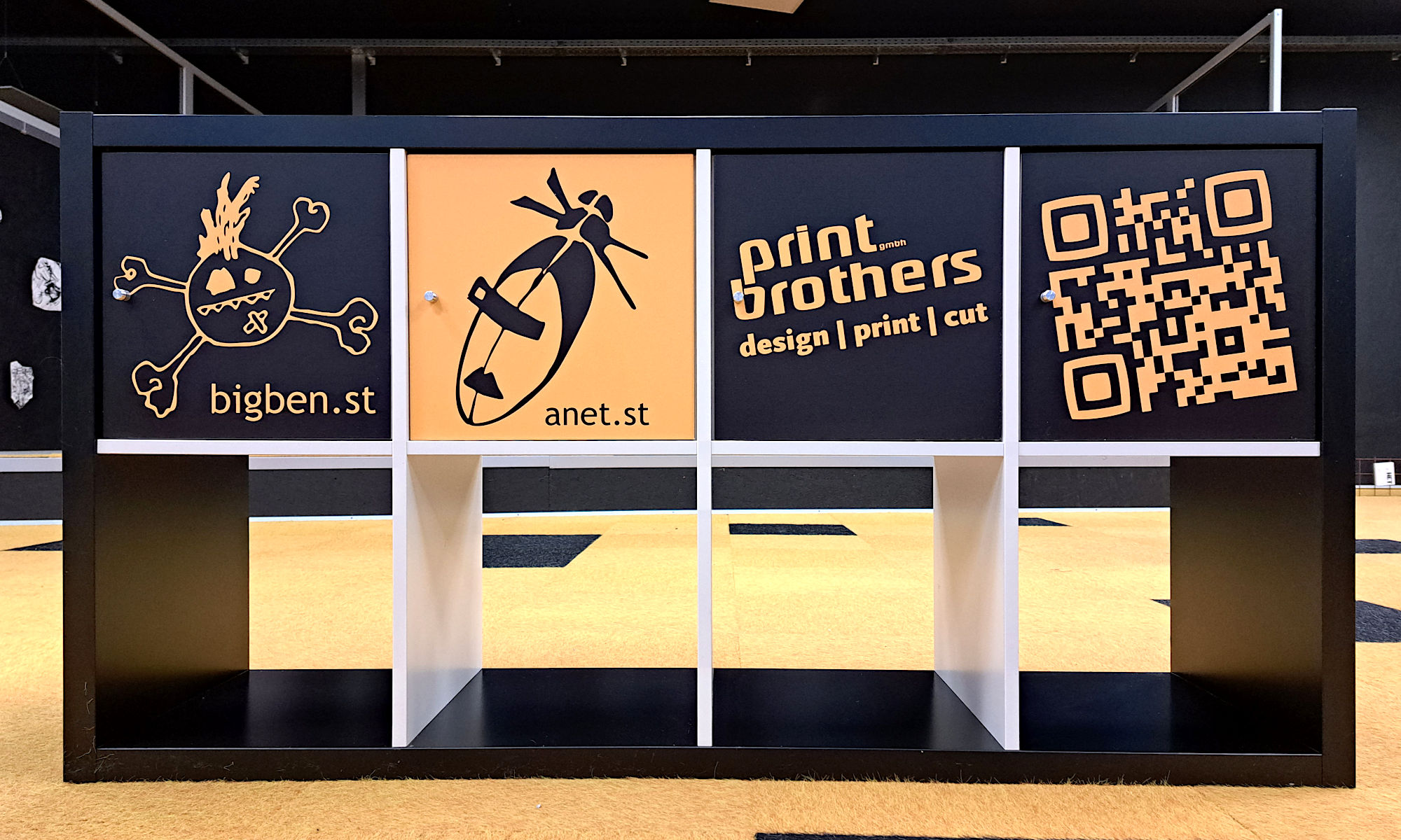 Das ursprünglich schwarz/weiße Möbelstück ist mit dem typischen Firmen-Schwarz/Gelb bedruckt und stammt aus der Zeit, als iXprint noch "print brothers" hieß. Seit damals bedruckt Harald mit seinem ca. 3x4 Meter großen UV-Druck-Giganten Holz mit der unterschiedlichsten Oberflächenbeschaffenheit: seien es Meterstäbe, Sperrholz- und Faserplatten oder Naturholz. ...Natürlich auch Glas, Alu, Fliesen, Steine etc. - aber dazu mehr anderntags.