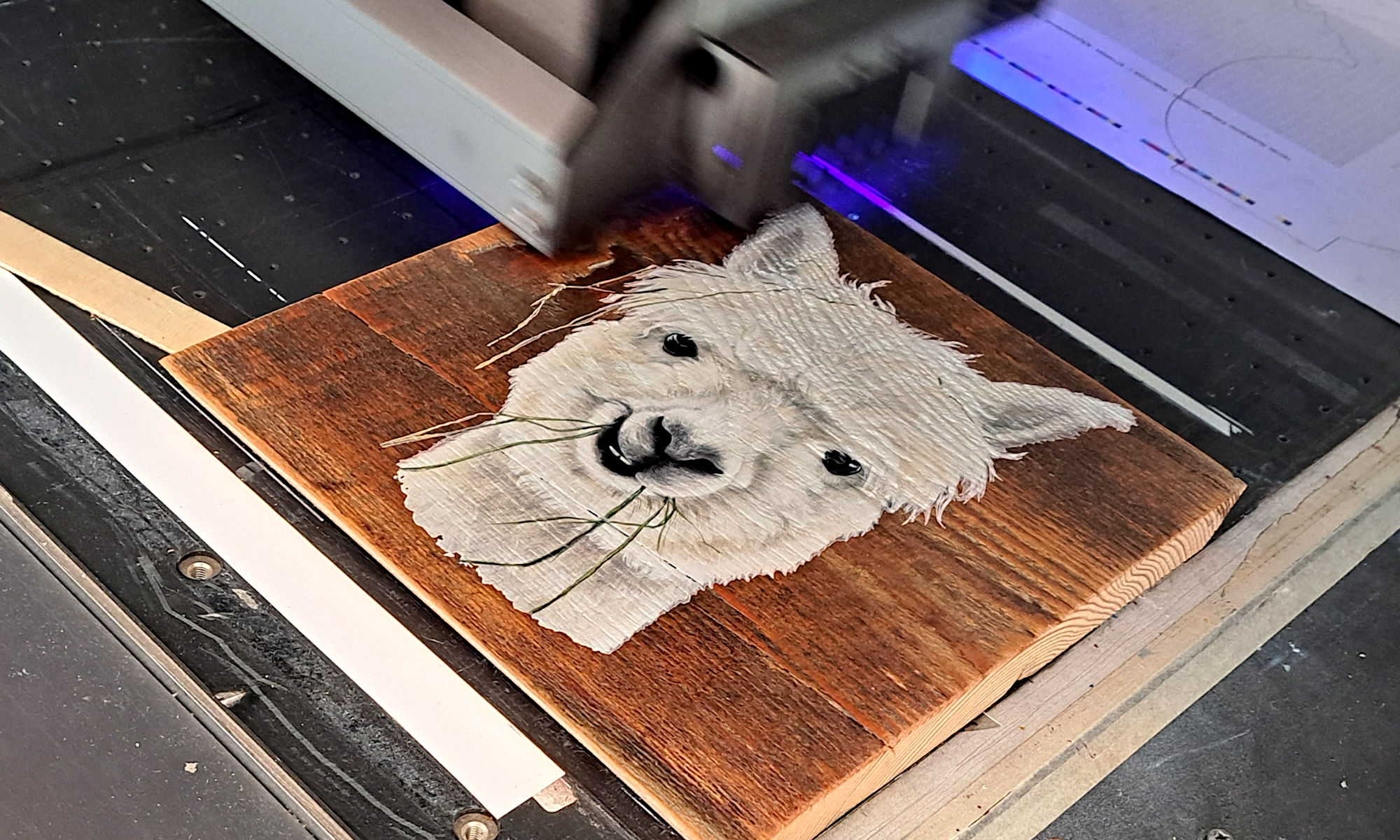 Wohin das Auge reicht, in unserer Produktion wimmelt es wieder von Alpakas. Auf Sperrholzplatten und Leinwänden haben wir sie bereits kennengelernt, diesmal tummeln sie sich auf Plakaten, Postkarten, Tassen und Holzbrettern. Die Malerin Sabine Golker Kunstmalerei/Pintora kennt übrigens jedes einzelne ihrer Models beim Namen, wohnen doch alle gemeinsam auf dem selben Hof, dem Zuchtbetrieb "Alpaka Molzbichl".